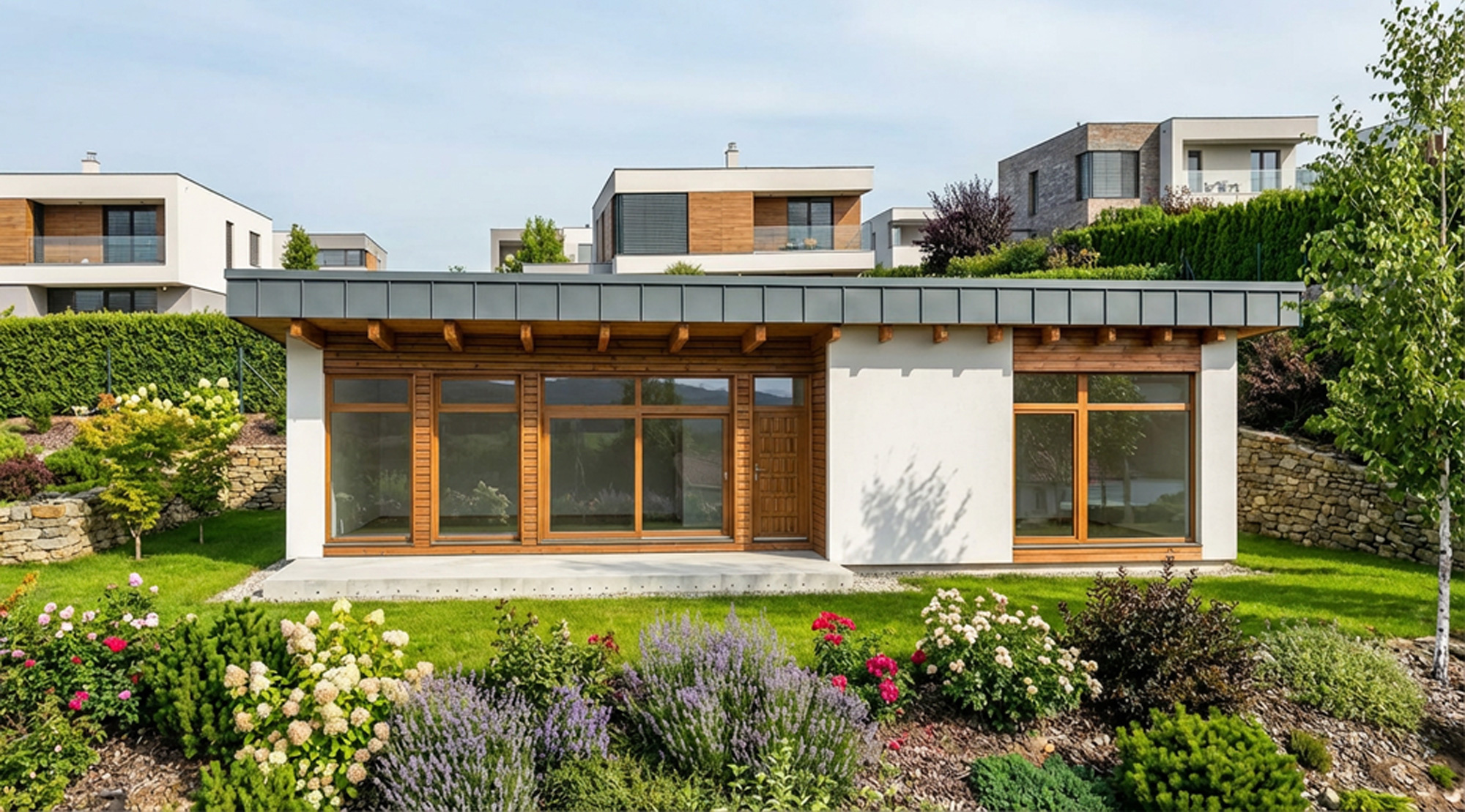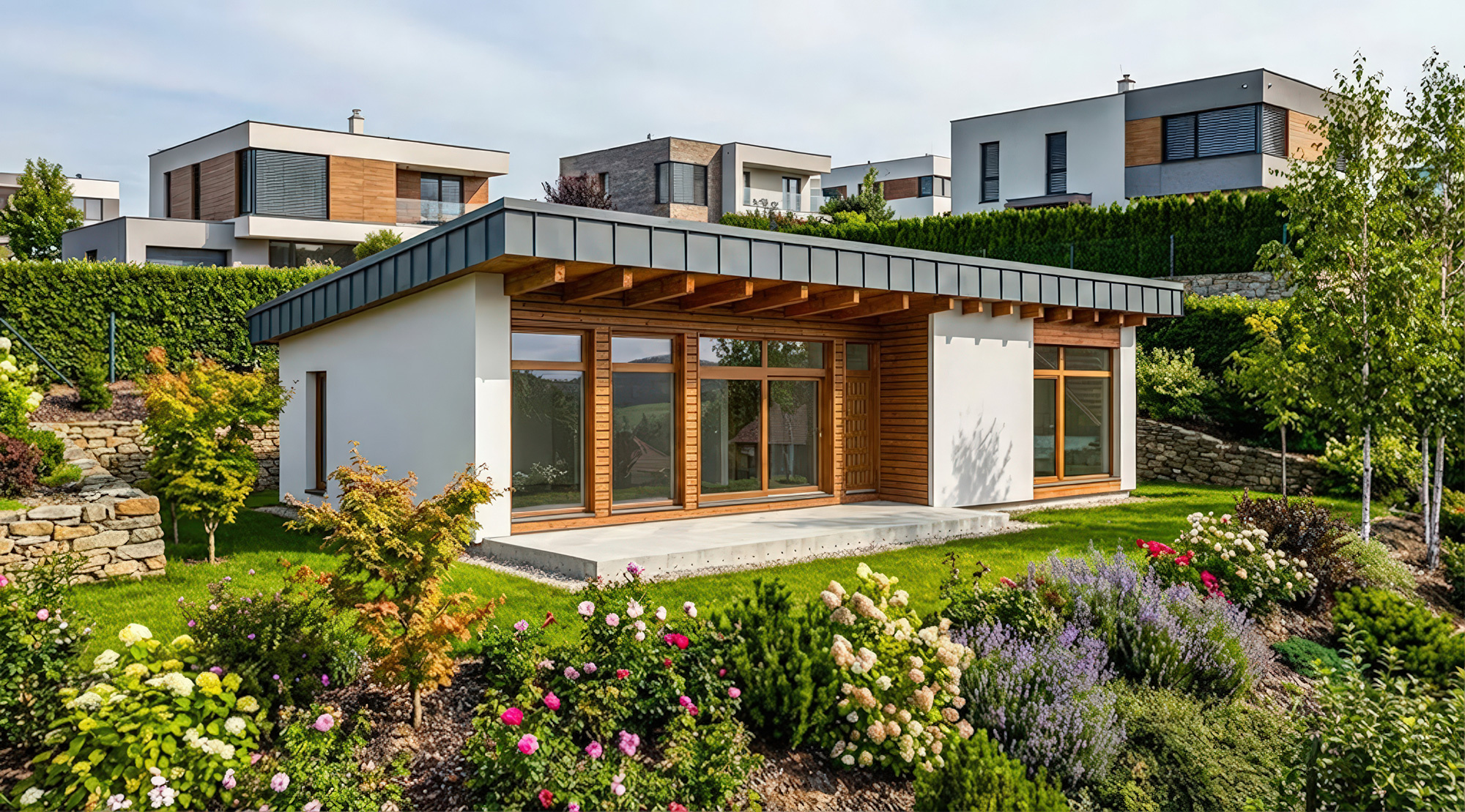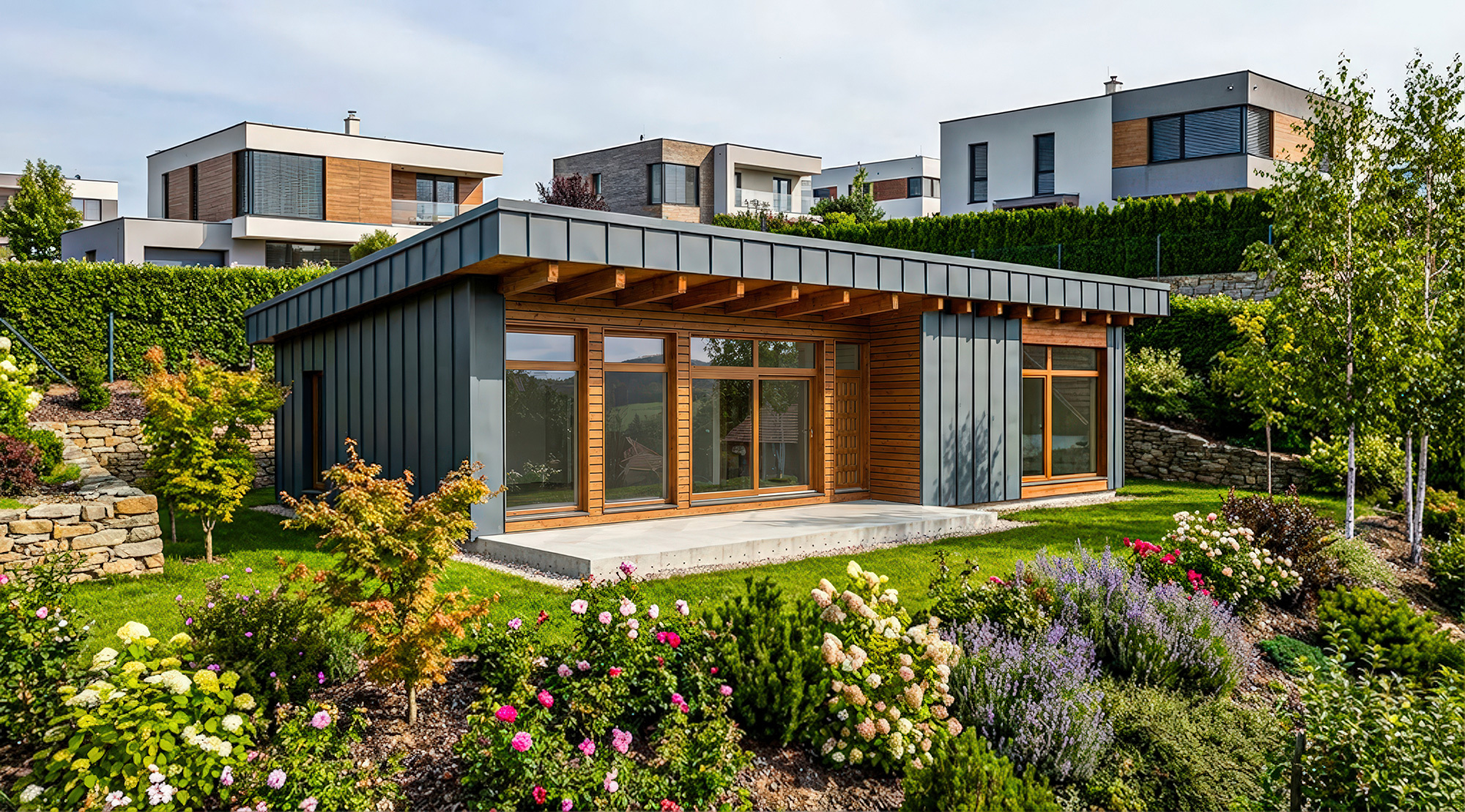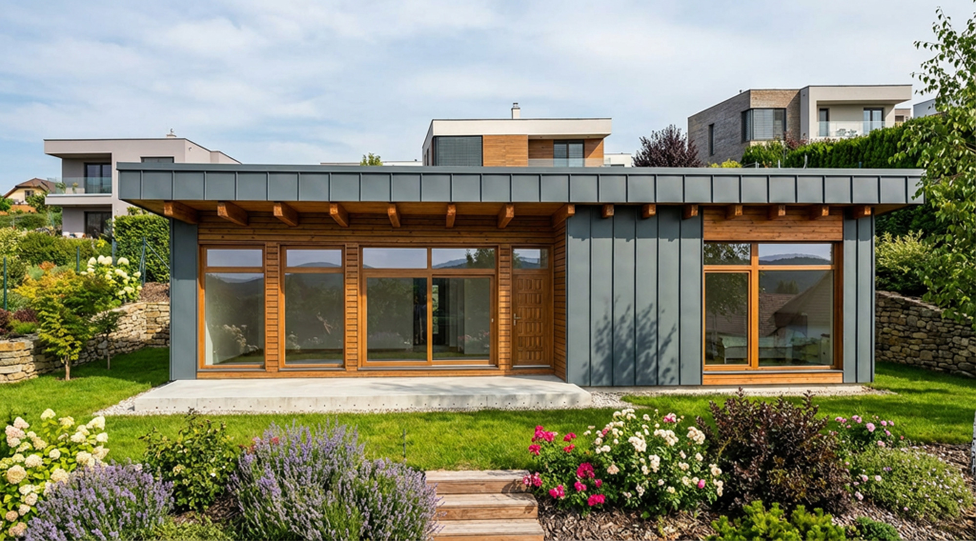 Tento nízkoenergetický bungalov o dispozici 3+kk představuje harmonické spojení technické preciznosti a přírodního materiálu.